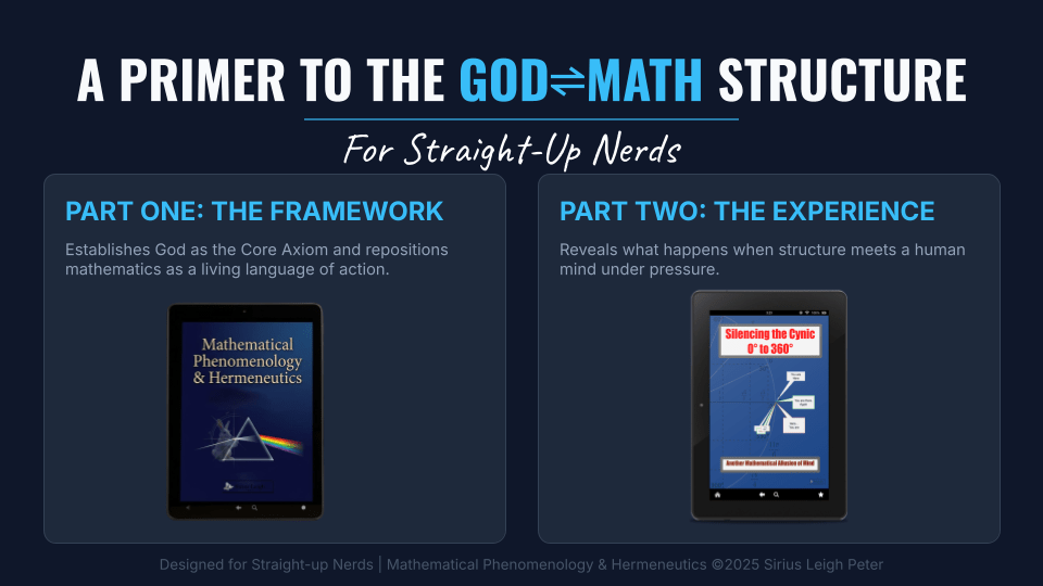 A Primer to the God⇌Math Structure for Straight-up Nerds operates as a cohesive, two-part survival mechanism for the mind, bridging abstract theory with the pressures of lived experience. When viewed as a complete set, Part One provides the mental blueprint and geometry, while Part Two acts as the crucible where that blueprint is constructed and tested against reality.